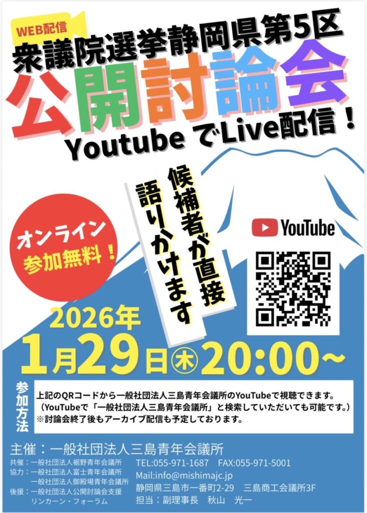 静岡県第5区 公開討論会がオンラインで開催されます。